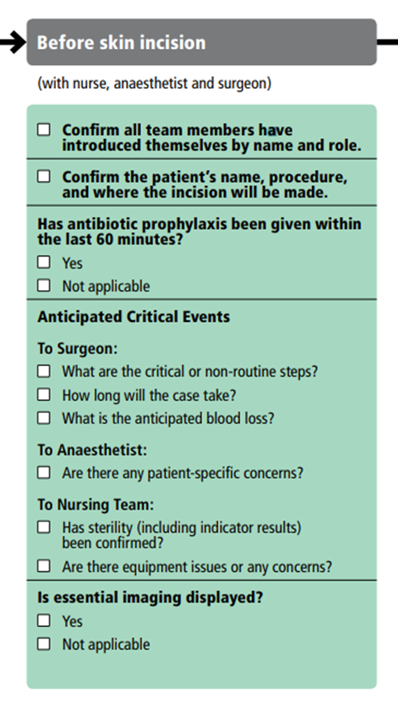 You were introduced to the surgical safety checklist as a patient safety tool in course 1. You reviewed part 1 (the briefing) prior to the induction of anesthesia. Now after the surgical drapes are in place but BEFORE the skin incision, part 2 of the surgical safety checklist must occur – the TIME OUT.